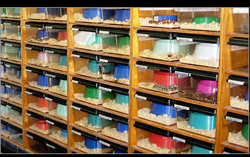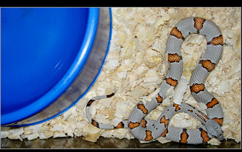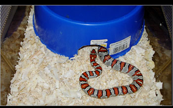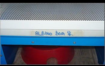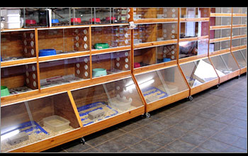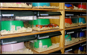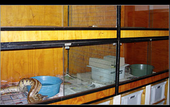| Larger snakes are housed in more conventional type housing with a temperature gradient provided by means of a heating pad situated under the end of each cage. | ||||||||||||||